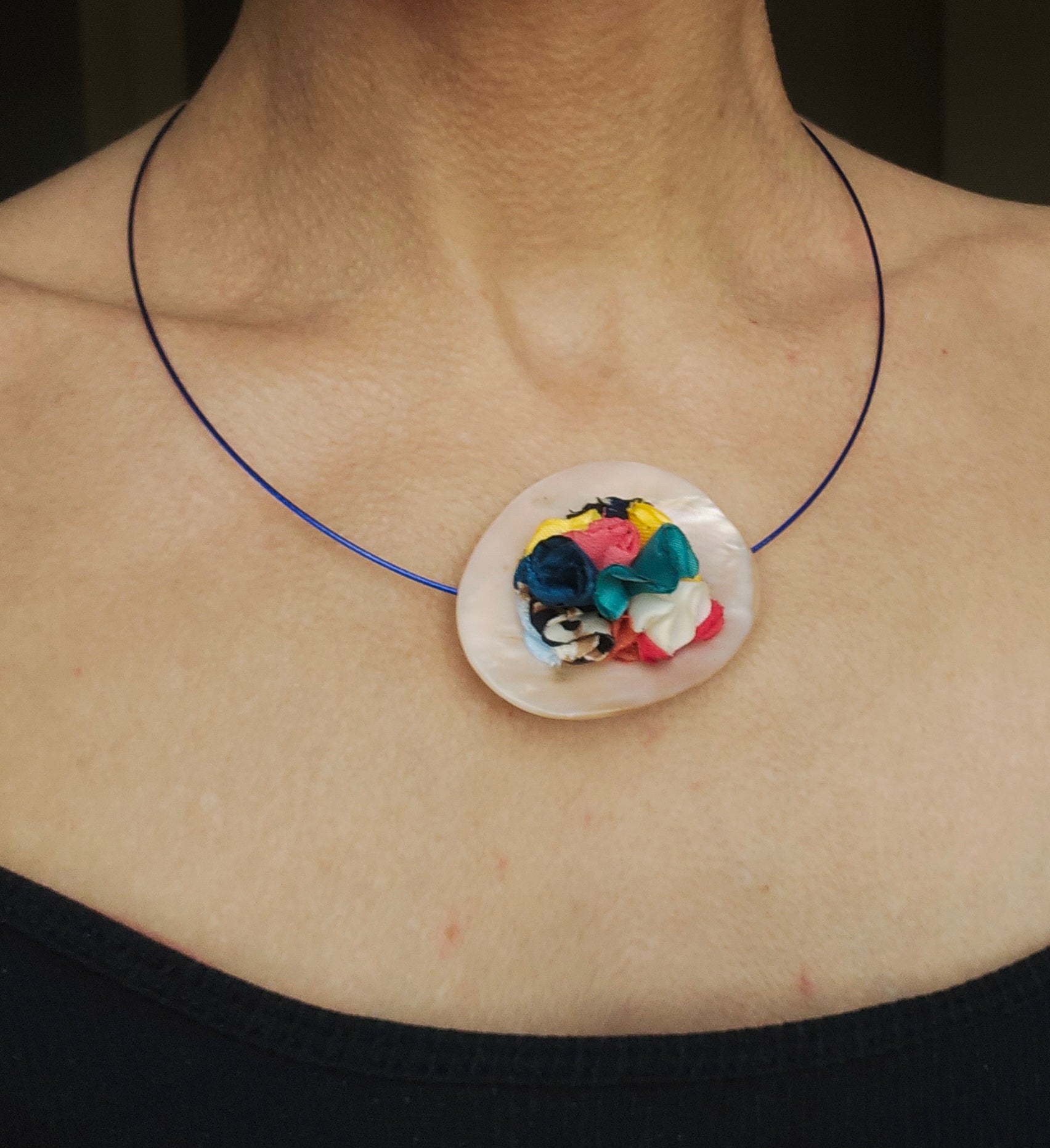 - Matériaux recyclés : fleurs de tissus taffeta sur un support de coquillage nacré.