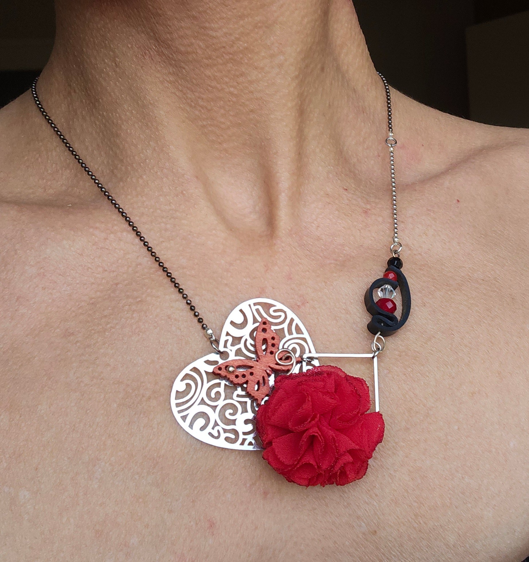 - Matériaux recyclés : chainettes, fleurs de tissus taffeta et accessoires upcyclés : coeur acier inoxydable, chambre à air, perle, papillon de bois.